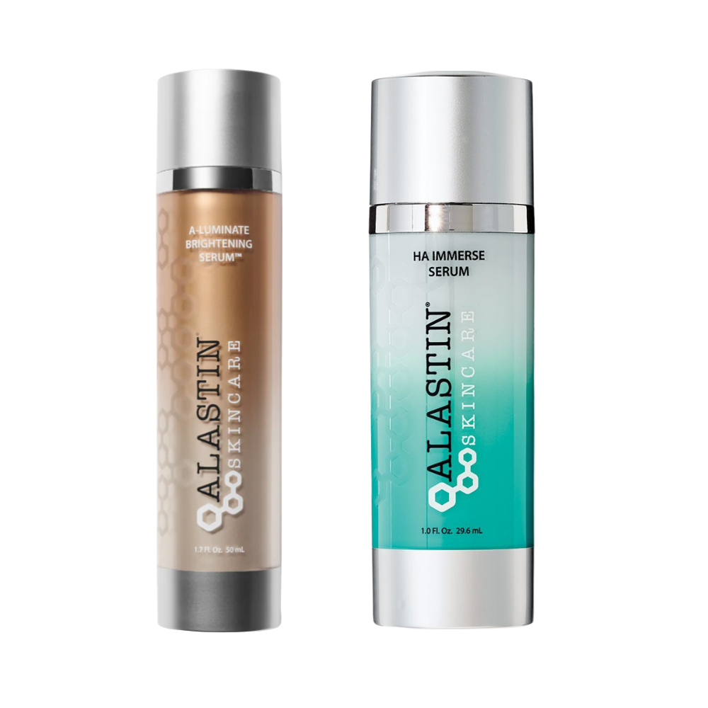 Transform your skin with the Alastin Hydrate & Brighten Serum Set, featuring two award-winning serums that deliver hydration and brightening benefits. This full-sized kit combines the HA Immerse Serum, winner of New Beauty's "Best Hyaluronic Acid" award and Oprah Daily's "Best Hydrating Serum," with the A-Luminate Brightening Serum for a complete skincare solution.