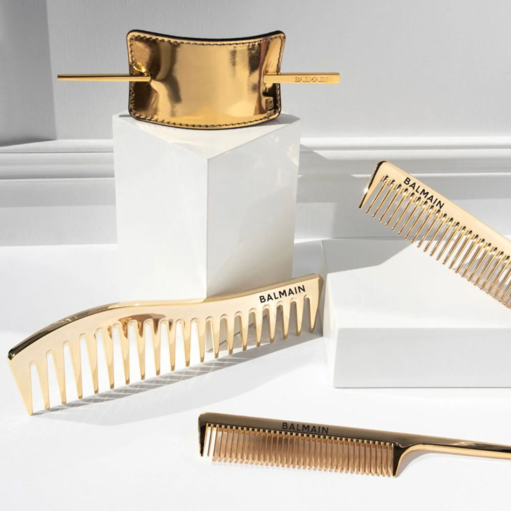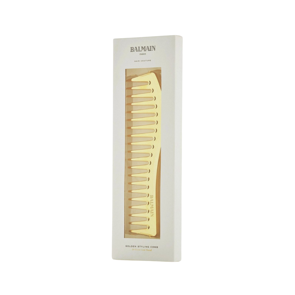 The Balmain Golden Styling Comb is a distinguished piece from the exclusive Golden Comb Collection by Balmain Paris Hair Couture. This premium styling tool is crafted with authentic 14K gold-plating, merging opulence with functionality. The professional-grade comb features wide teeth specifically designed to glide effortlessly through hair, minimising breakage and preventing damage.