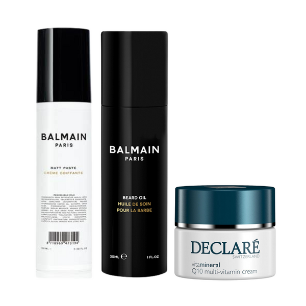 Achieve a polished and well-groomed look with the Balmain Homme Set. This comprehensive set includes the Balmain Homme Beard Oil, Balmain Matt Paste, and Declare Men VitaMineral Q10 Multi-Vitamin Cream, providing everything you need for styling and skincare.