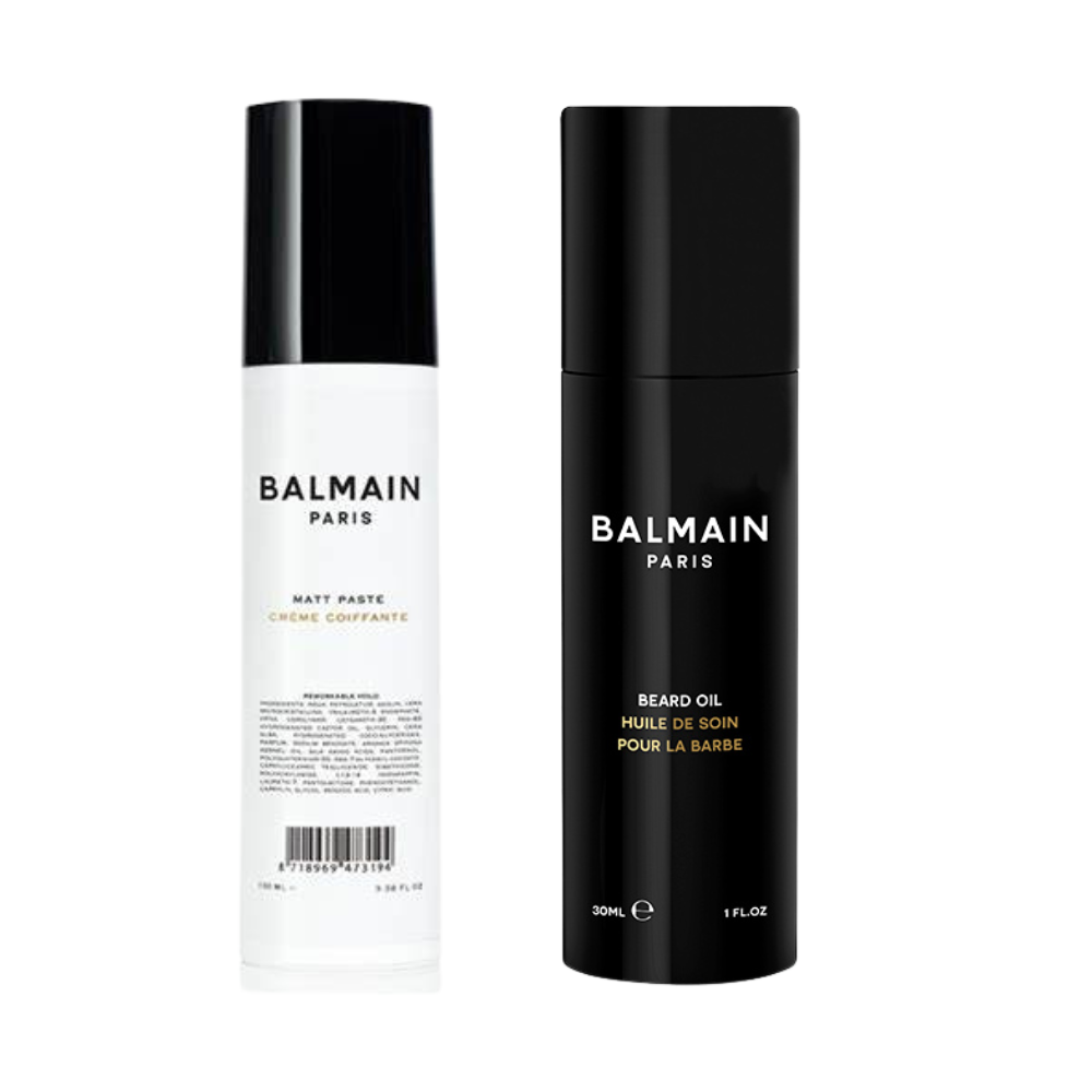 The Balmain Matt Paste allows you to mould and shape your hair into any style with a re-mouldable hold and matt finish, while the Balmain Homme Beard Oil nourishes and styles your beard, preventing dryness of the skin underneath.