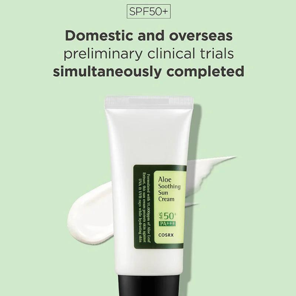 Embrace your day in the sun with the COSRX Aloe Soothing Sun Cream SPF50+ PA+++, your go-to sunscreen that combines high-level protection with deep hydration.