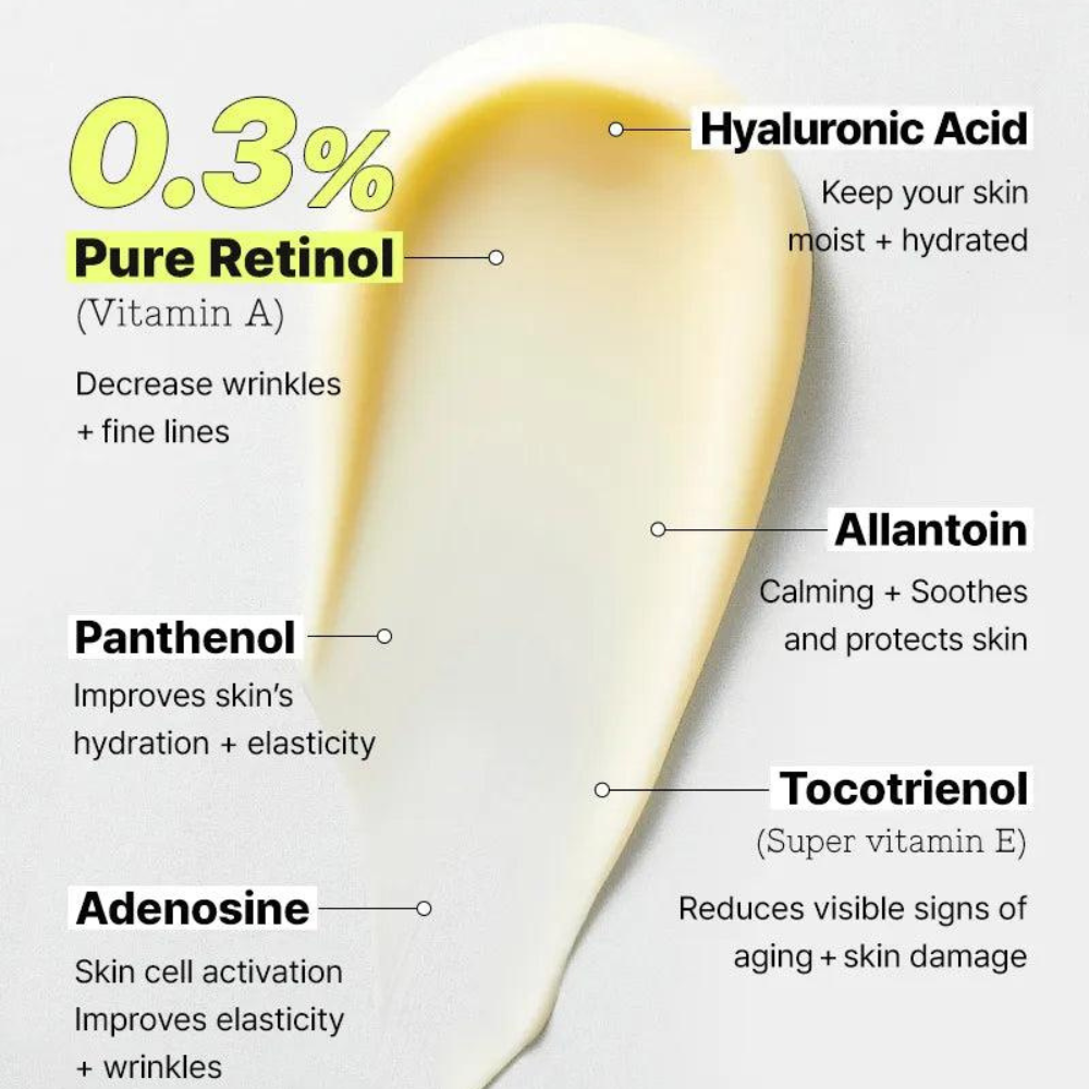 Water, Caprylic/Capric Triglyceride, Butylene Glycol, Glycerin, Glycine Soja (Soybean) Oil, Tocopherol, Tocopheryl Acetate, Cetearyl Alcohol, Trehalose, Panthenol, Butyrospermum Parkii (Shea) Butter, Ammonium Acryloyldimethyltaurate/VP Copolymer, Dimethicone, Glyceryl Polymethacrylate, Polyglyceryl-10 Stearate, Hydrogenated Lecithin, Helianthus Annuus (Sunflower) Seed Oil, Hydroxyethyl Acrylate/Sodium Acryloyldimethyl Taurate Copolymer, Carbomer, Retinol (0.3%), Tromethamine, Glyceryl Stearate, Polysilicone-11, Sodium Sulfite, Daucus Carota Sativa (Carrot) Root Extract, Allantoin, Glyceryl Caprylate, Propanediol, Oryza Sativa (Rice) Bran Wax, Tocotrienols, Stearic Acid, Polyglyceryl-3 Methylglucose Distearate, Palmitic Acid, Ethylhexylglycerin, Disodium EDTA, Adenosine, Sodium Hyaluronate, Sorbitan Isostearate, 1,2-Hexanediol, Elaeis Guineensis (Palm) Oil, Hydrolyzed Hyaluronic Acid, Beta-Carotene, Sodium Hyaluronate Crosspolymer, Myristic Acid, Hyaluronic Acid, Lauric Acid, Sodium Acetylated Hyaluronate, Ascorbic Acid, Limnanthes Alba (Meadowfoam) Seed Oil, 3-O-Ethyl Ascorbic Acid, Glutathione.