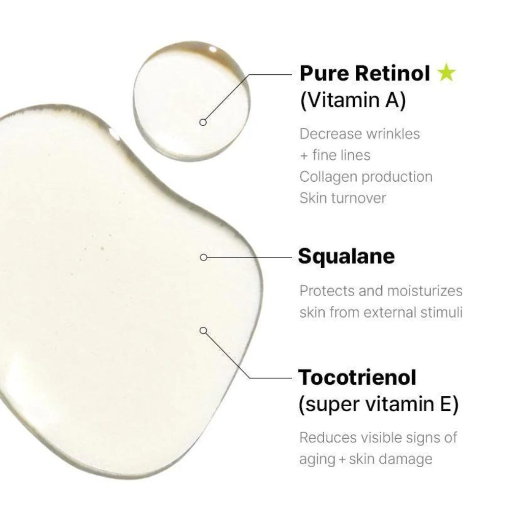 Squalane, Glycine Soja (Soybean) Oil, Di-C12-13 Alkyl Malate, Retinol (0.5%), Caprylic/Capric Triglyceride, BHT, Tocotrienols, Tocopherol, Elaeis Guineensis (Palm) Oil, Hydroxymethoxyphenyl Decanone.