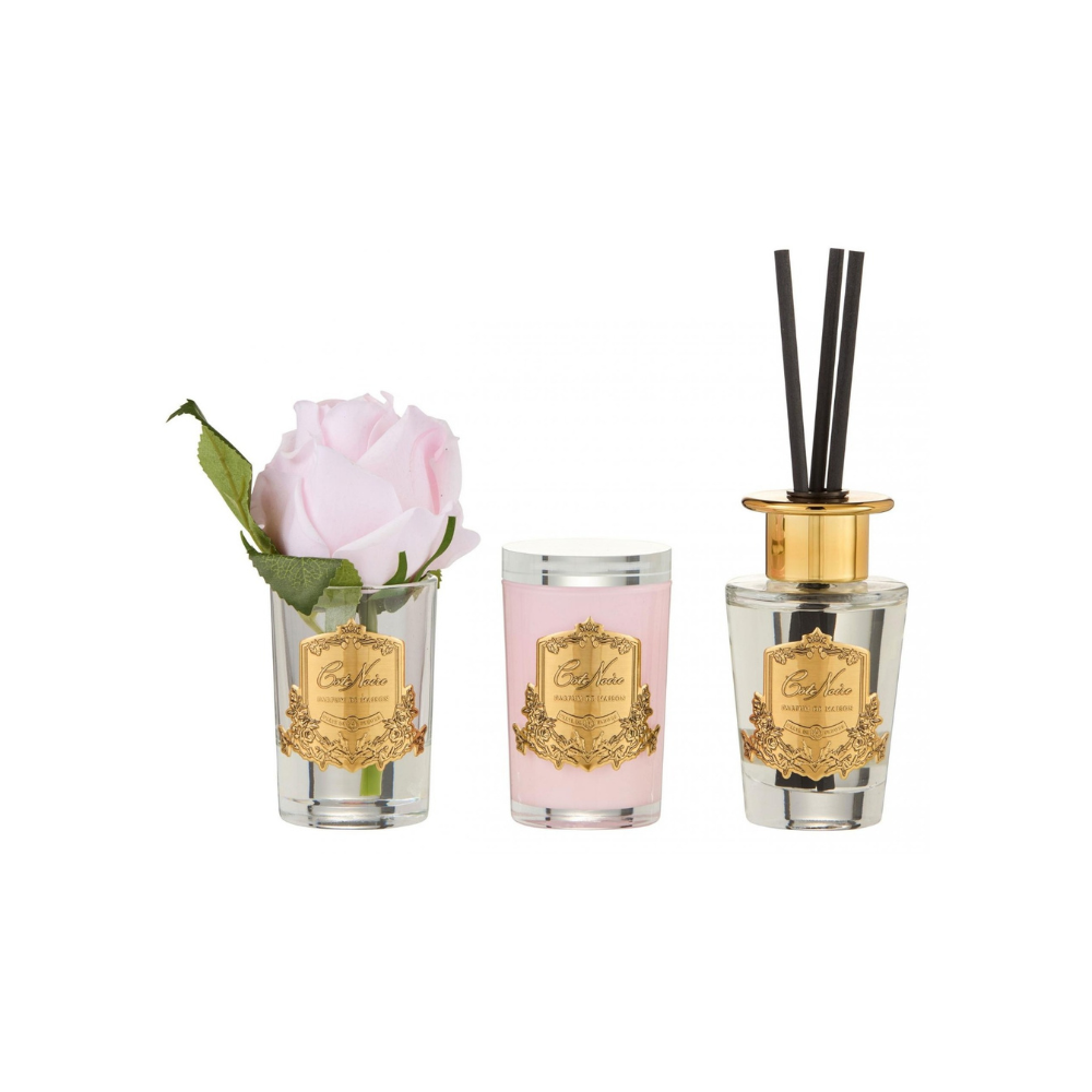 The set features a beautifully crafted rose bud arrangement infused with fine fragrance, a hand-poured 75g glass candle made from a paraffin-free blend of soy, coconut, and beeswax, and a 100ml reed diffuser that delivers consistent fragrance for up to two months. Complete with fragrance sprays to refresh your rose petals, this collection offers multiple ways to enjoy your chosen scent.