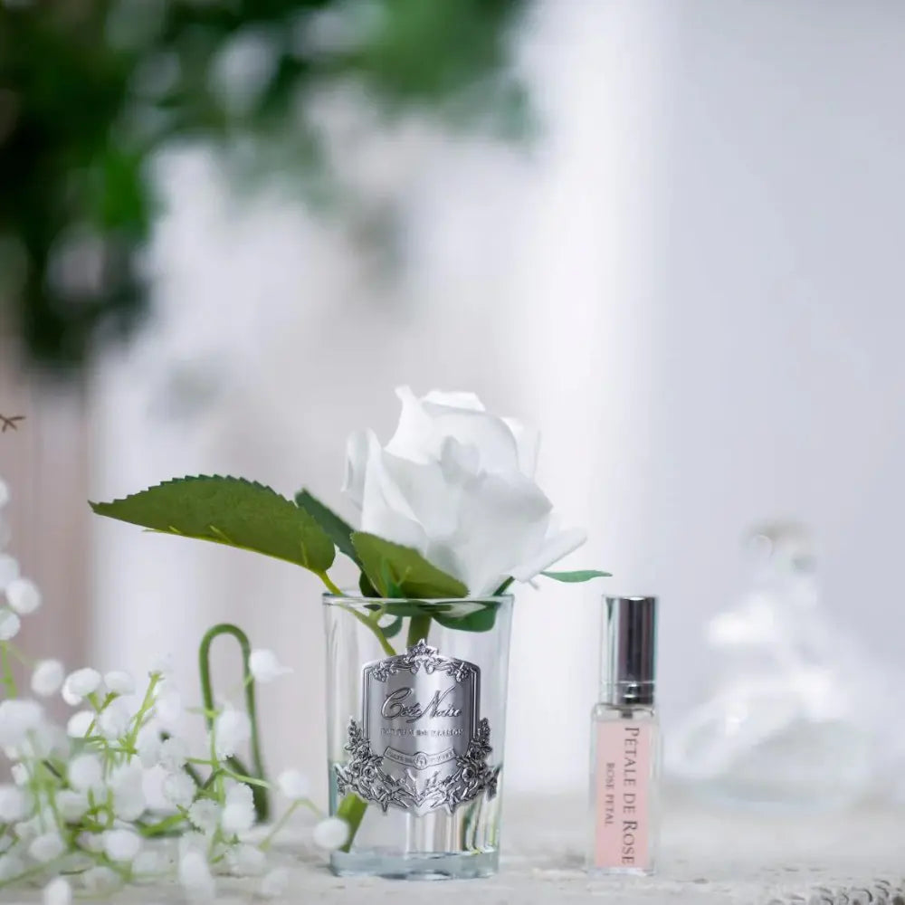 Each petal is meticulously designed to replicate the delicate texture of nature, presented in pristine ivory white. The rose acts as an elegant diffuser, releasing its gentle fragrance throughout the day while requiring no maintenance, making it perfect for both home and office spaces.