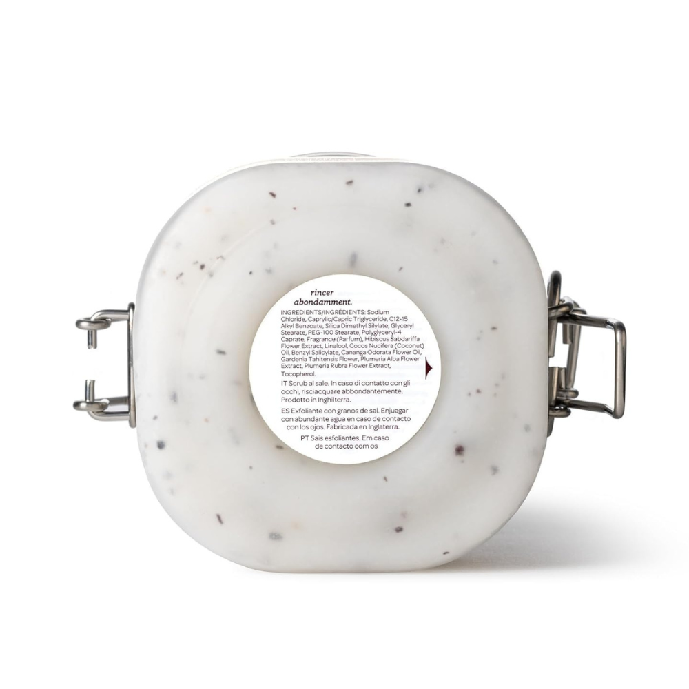 Sodium Chloride (Salt), Caprylic/Capric Triglyceride, C12-15 Alkyl Benzoate, Cocos Nucifera (Coconut) Oil, Silica Dimethyl Silylate, Glyceryl Stearate, PEG-100 Stearate, Polyglyceryl-4 Caprate, Fragrance (Parfum), Hibiscus Sabdariffa (Hibiscus) Flower Powder, Linalool, Amyl Cinnamal, Hydroxycitronellal, Plumeria Rubra (Frangipani) Flower Extract, Plumeria Alba (Frangipani) Flower Extract, Gardenia Tahitensis (Tiare) Flower Extract, Tocopherol