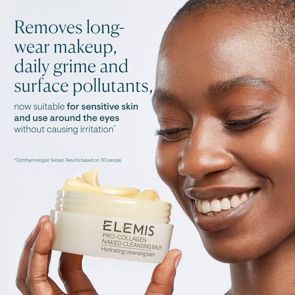 Elemis Pro-Collagen Naked Cleansing Balm is a gentle yet effective triple-texture cleanser designed for sensitive skin. This ophthalmologist-tested formula begins as a rich balm that melts into a nourishing oil, then transforms into a hydrating milk when mixed with water to thoroughly cleanse without irritation.