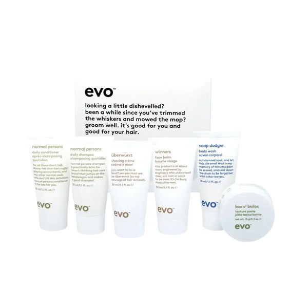 • Includes shampoo, conditioner, shaving crème, face balm, body wash, and hair paste