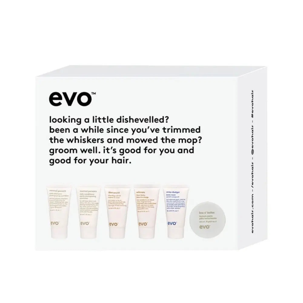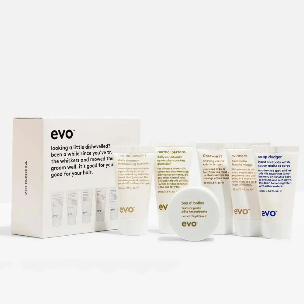 The Grooms Crew Gift Pack is a comprehensive grooming kit packed with essentials for hair, face, and body, all in convenient travel-size sizes. This versatile pack includes Normal Persons Daily Shampoo and Conditioner for hair care, Überwurst Shaving Crème for a smooth shaving experience, Winners Face Balm for post-shave skin care, Soap Dodger Hand and Body Wash for all-over cleansing, and Box o' Bollox Texture Paste for hair styling.