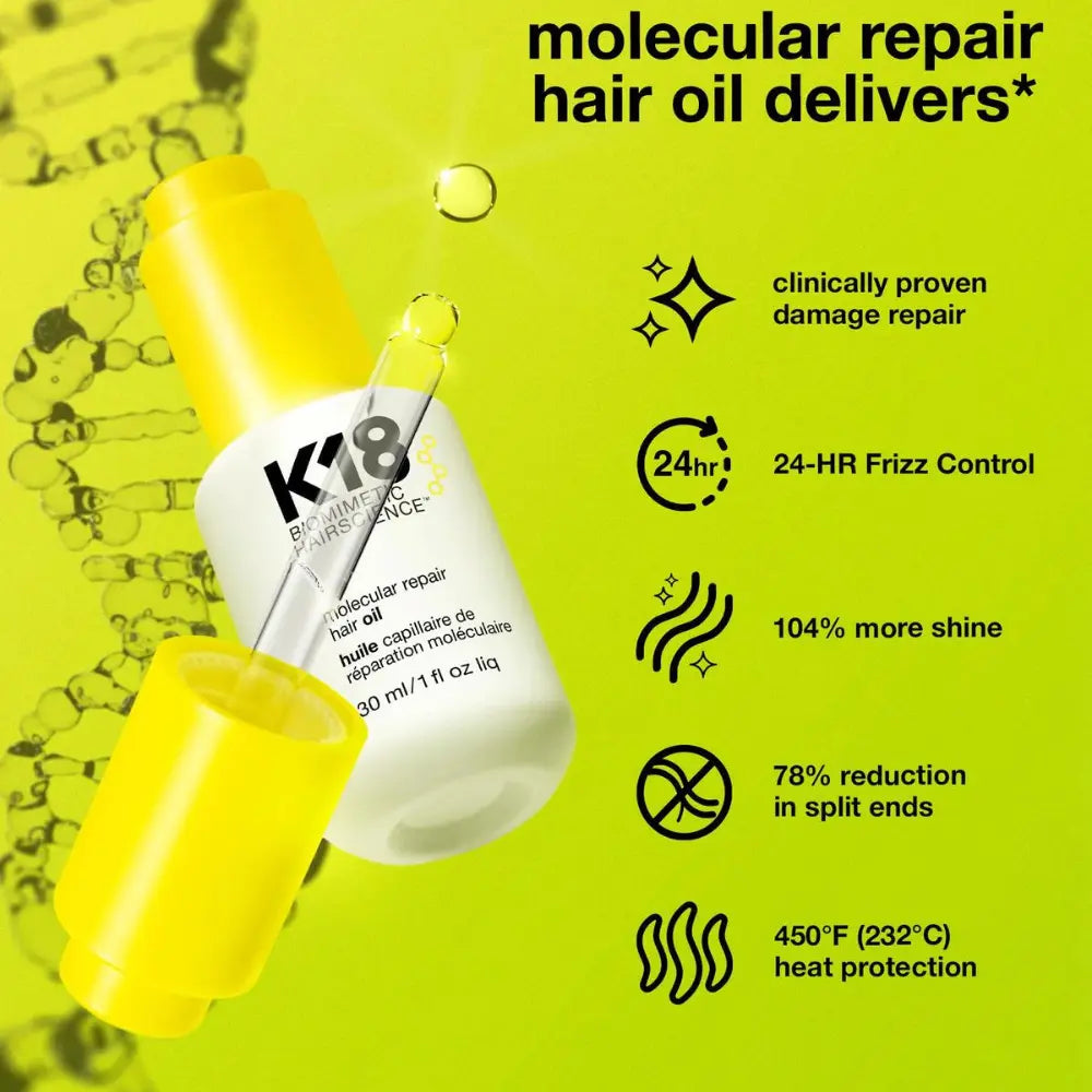 - Got the K18 molecular repair mask? Use the mask first on clean, damp hair, then wait 4 minutes. Apply the molecular repair hair oil, and wait 4 minutes for maximum strengthening results.