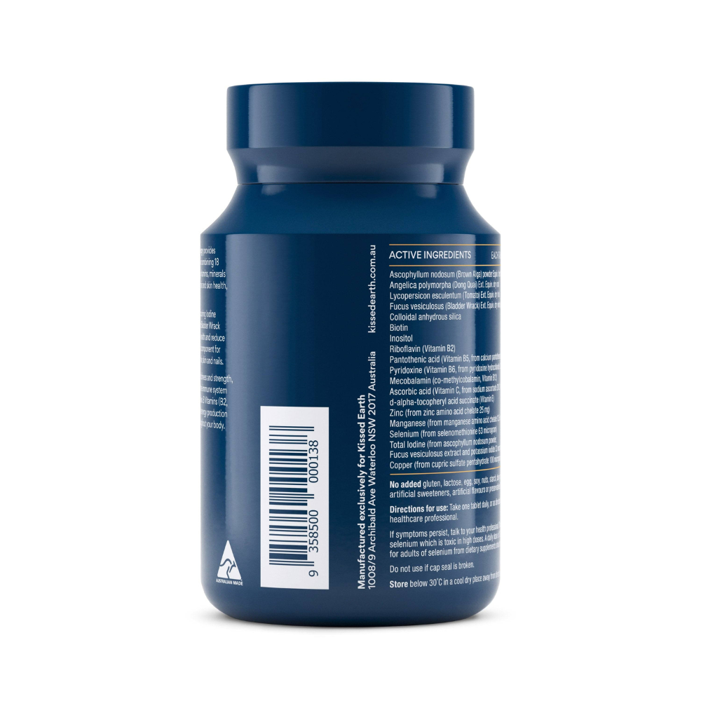 natural iodine from Bladder Wrack and Brown Algae for thyroid and hair health, Silica and Zinc for hair thickness, and Dong Quai for skin regeneration, it's your daily dose of beauty and vitality.