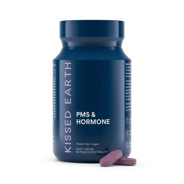 Introducing Kissed Earth PMS & Hormone Vitamin, a revolutionary 60-piece supplement meticulously crafted for women seeking natural hormonal balance and relief from premenstrual and menopausal discomfort.