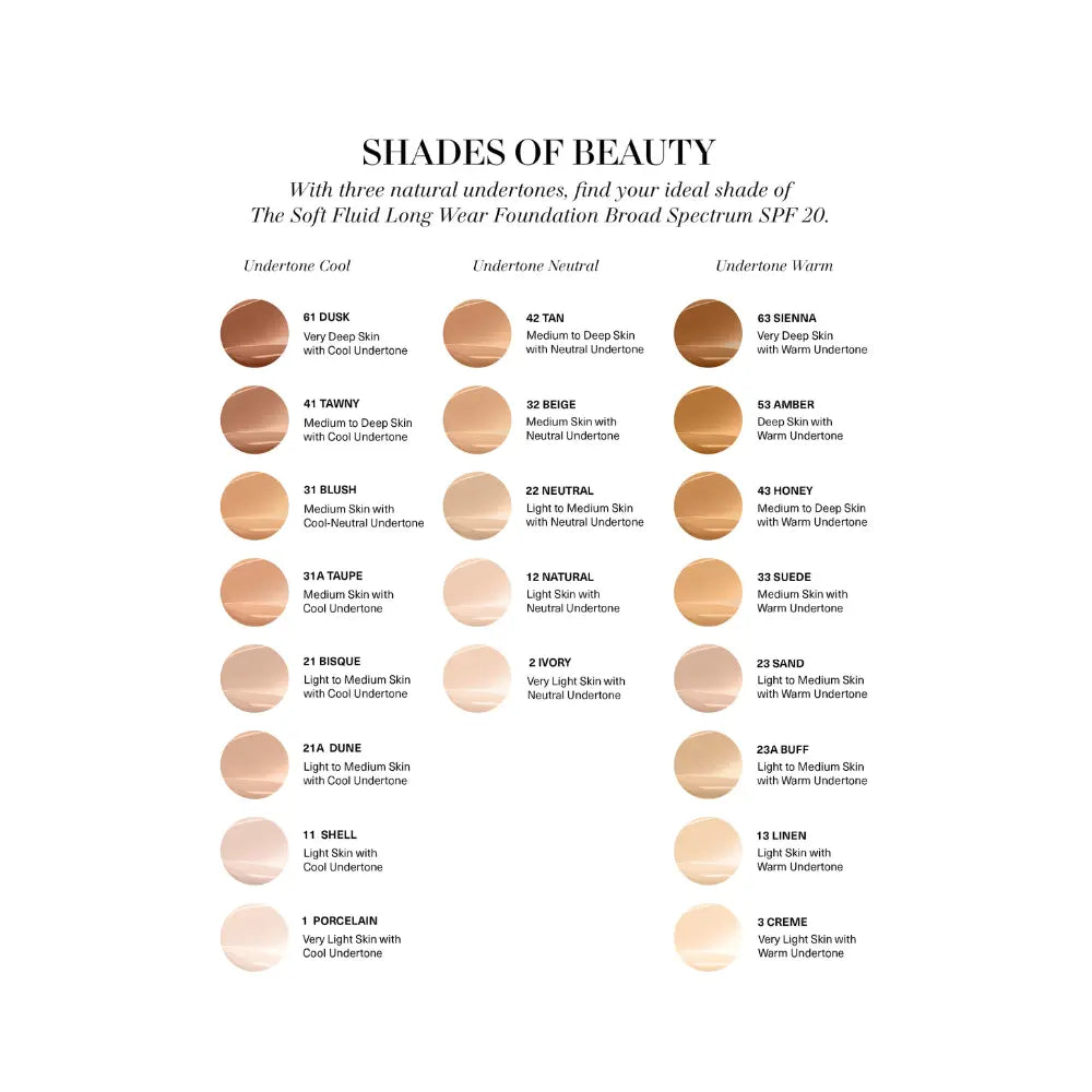 Colour Capsule Technology ensures a flawless match to your skin - no matter your skin tone. The colour pigments of Soft Fluid Long Wear Foundation SPF 20 are suspended in transparent spheres, making sure it leaves your skin with a natural finish and true-to-life colour match.
