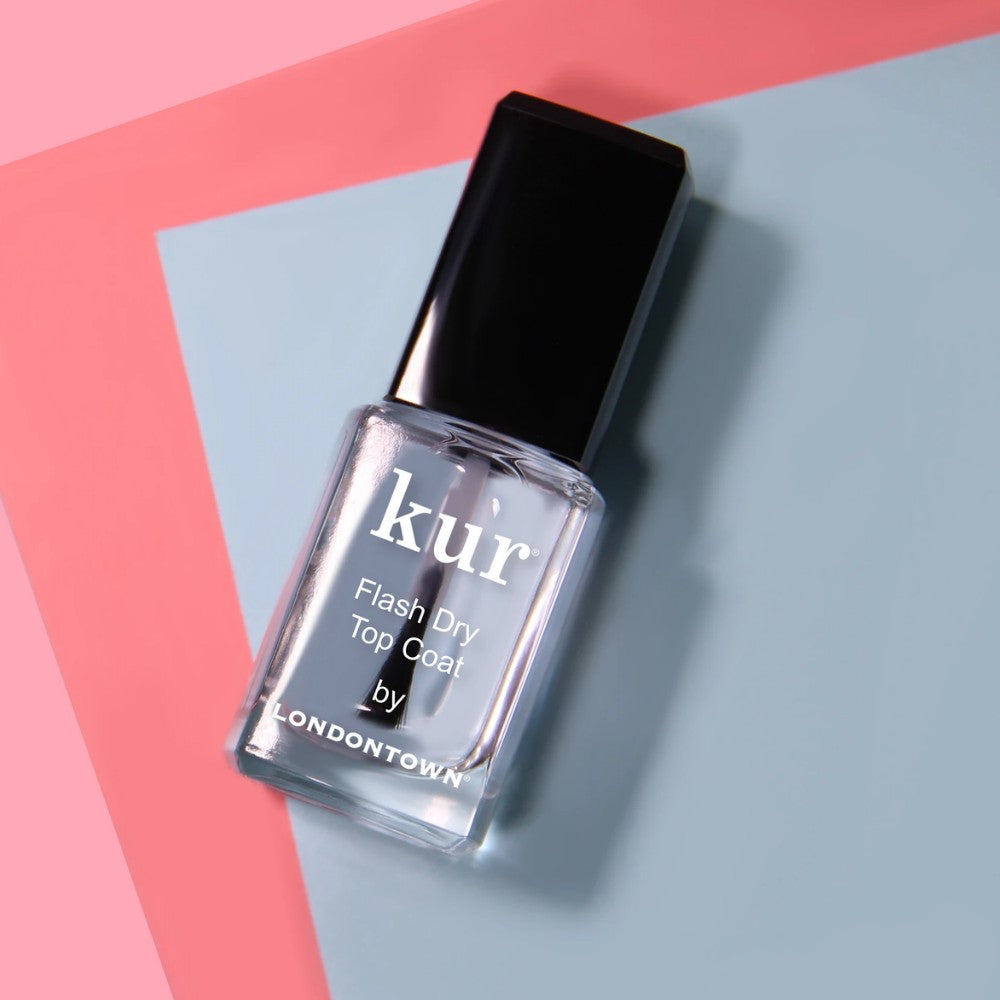 - Apply a layer of Londontown kur Flash Dry Top Coat to seal your manicure and fast dry your nail polish.