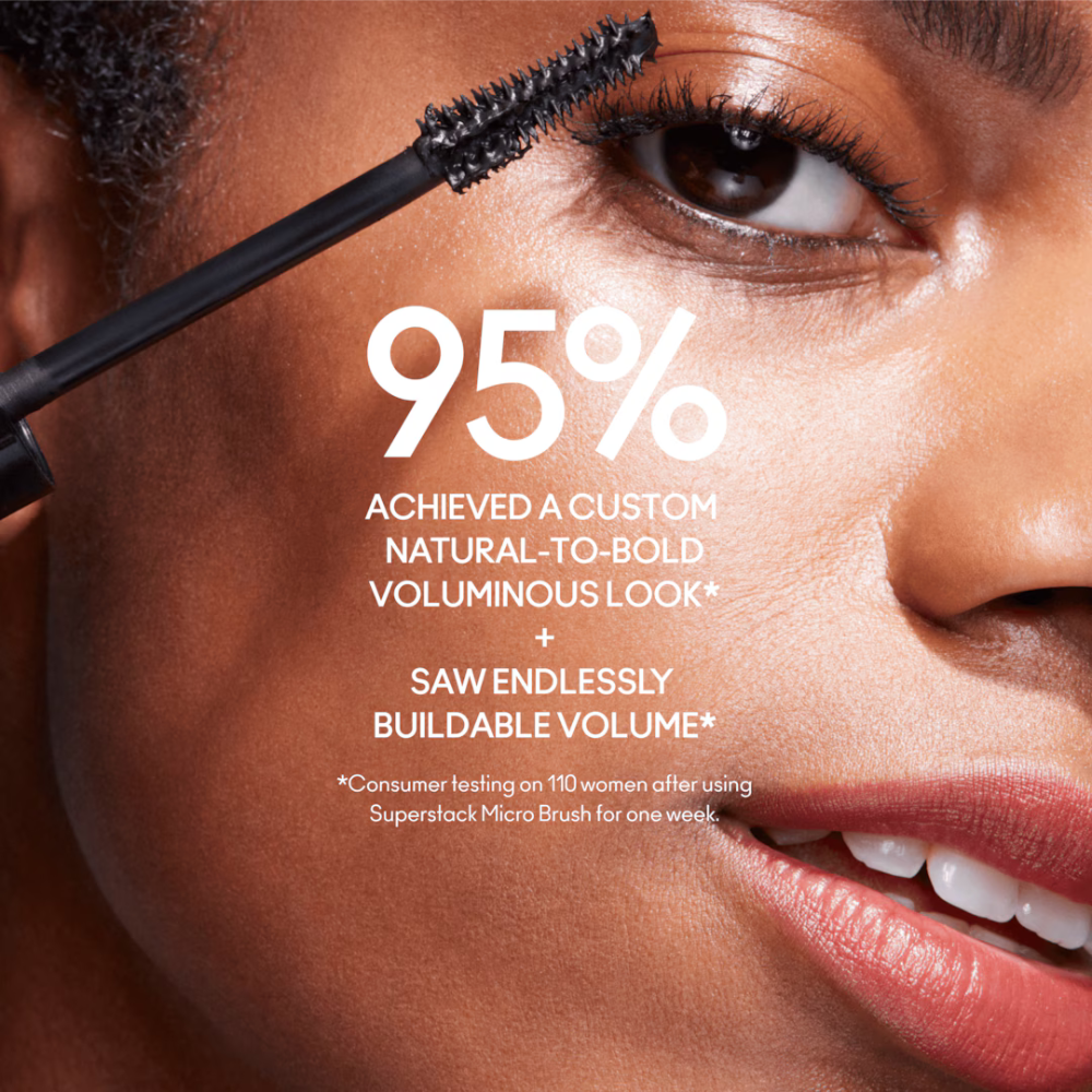 The unique Superstack Mega Brush provides instant volume and lift for longer upper lashes, while the Micro Brush option offers precise application for shorter or lower lashes. The weightless formula ensures 24-hour wear without flaking, perfect for creating gravity-defying volume that lasts all day.