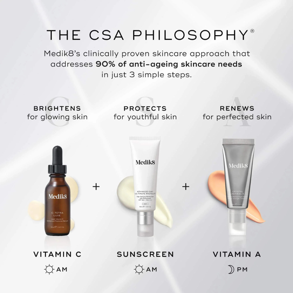 This complete set offers a scientifically-advanced approach to anti-ageing, with Medik8's innovative crystal encapsulation technology ensuring optimal results without irritation.