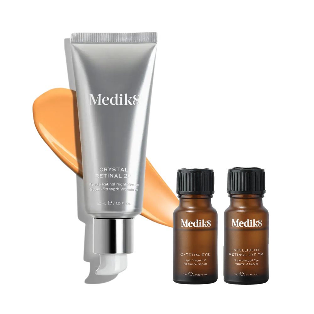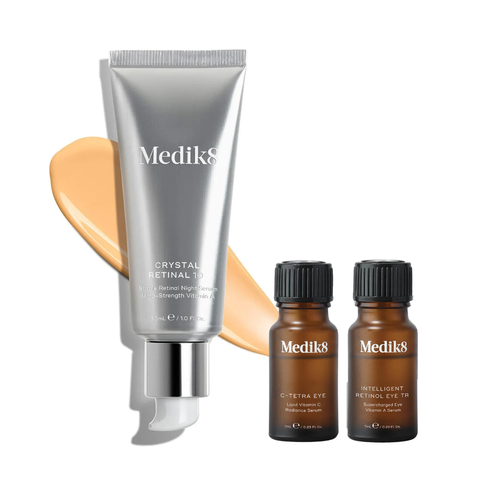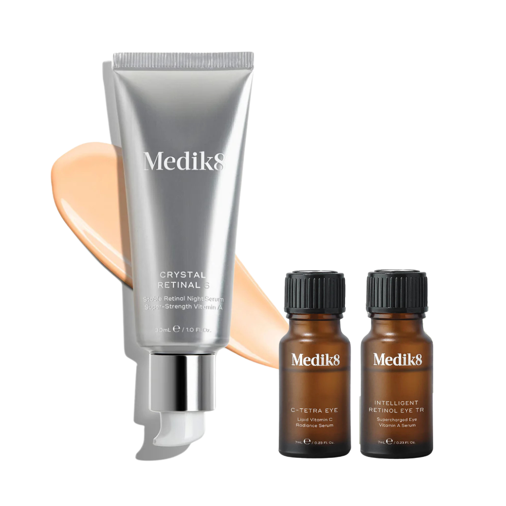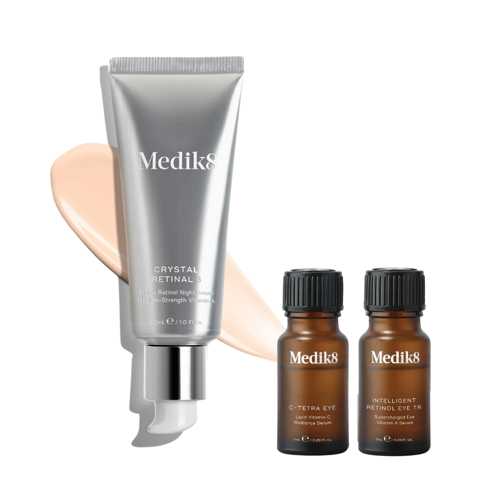 Transform your skincare routine with Medik8 Crystal Retinal Face & Eye Serums, a comprehensive trio that targets signs of ageing on both face and delicate eye area.