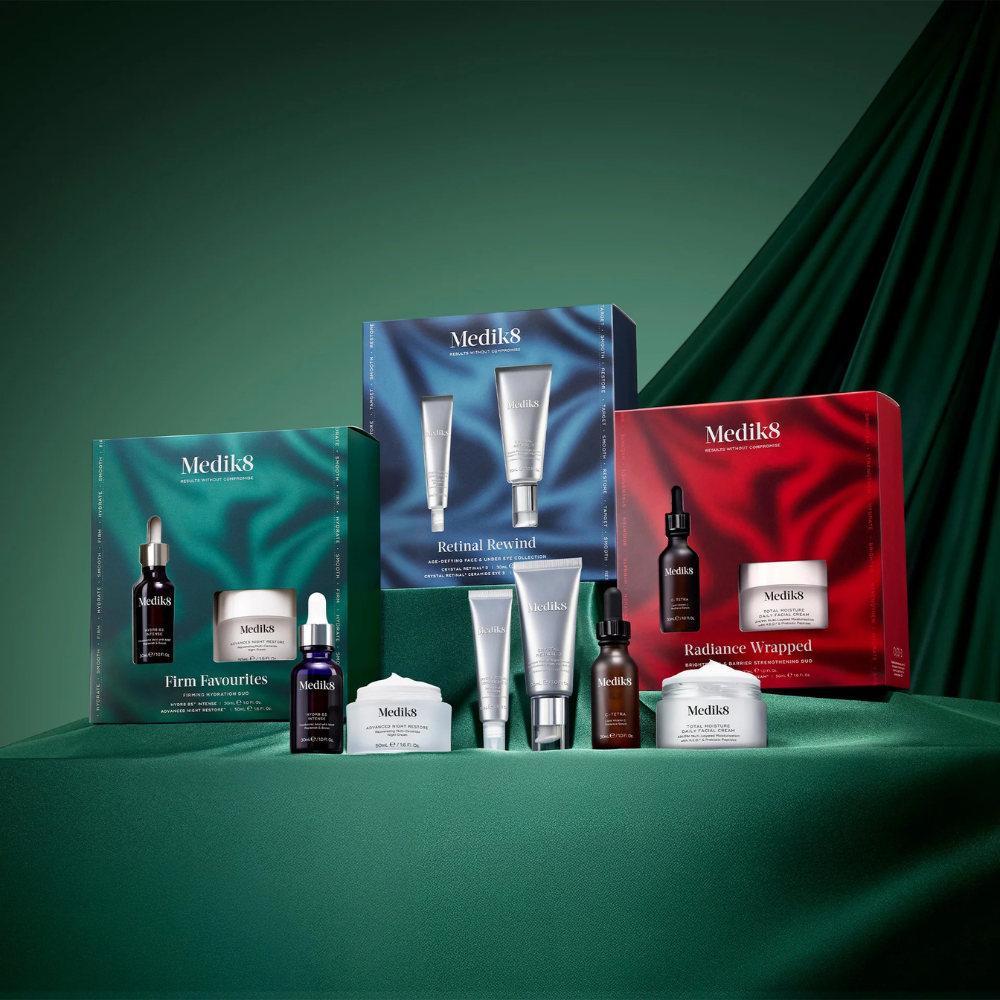 SkiTransform your skincare routine with the Medik8 Luminous Lift Gift Pack. This powerful duo combines Press & Glow, a gentle exfoliating toner that removes dead surface cells, with Liquid Peptides, an advanced anti-ageing serum.