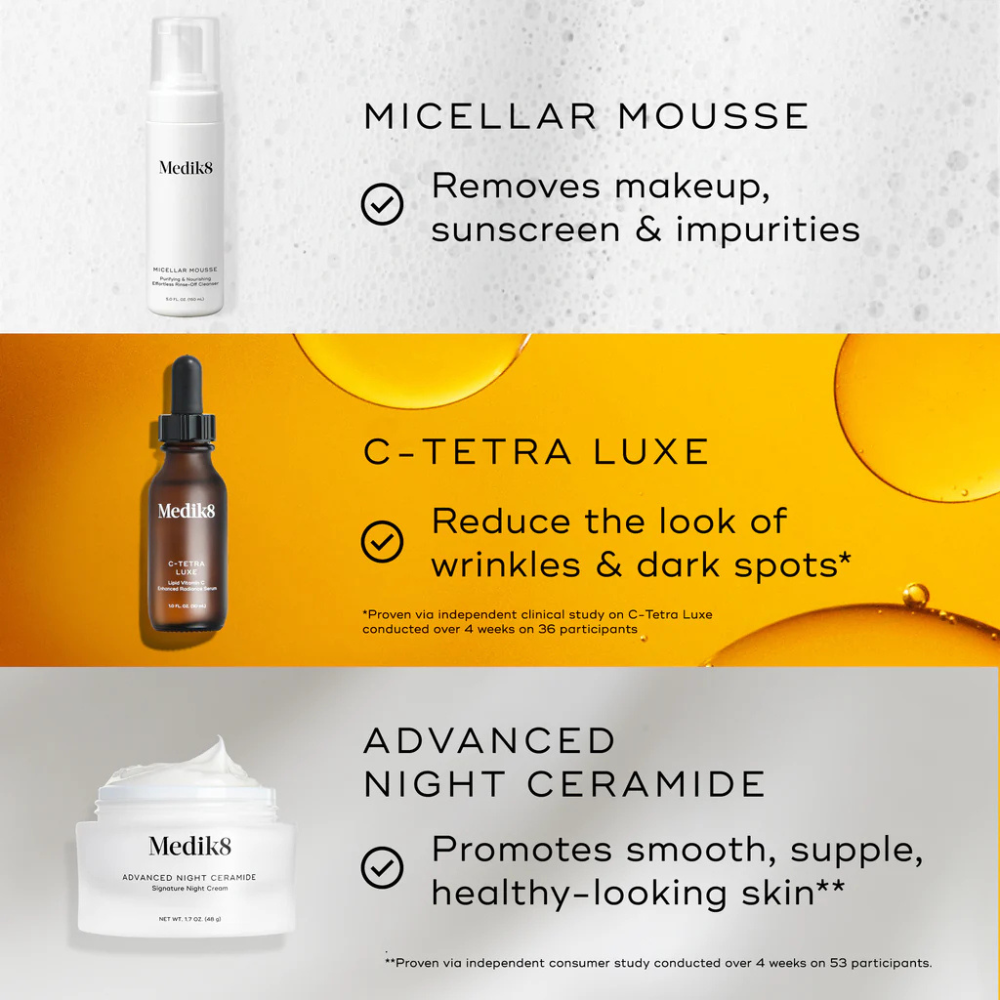 This travel-sized trio includes the gentle yet effective Micellar Mousse for pristine cleansing, C-Tetra Luxe for daily antioxidant protection and visible radiance, and Advanced Night Restore to replenish and firm skin overnight.