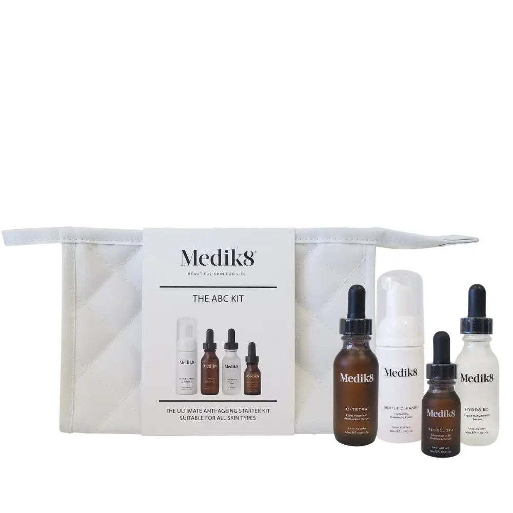 Medik8 ABC 키트 내용물: 화이트 코스메틱 백에 젠틀 클렌즈 40ml, 씨-테트라 30ml, Hydr8 B5 30ml, 레티놀 3TR 15ml