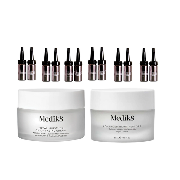 Perfect skin around the clock with the Medik8 & Vine Vera Day & Night Routine. This comprehensive trio delivers continuous care for your complexion, starting with Medik8 Total Moisture Daily Facial Cream which provides 100 hours of clinically-proven hydration and improves skin barrier function by 30%. Its H.E.O.® Technology combines with prebiotic peptides and multi-weight hyaluronic acid to keep skin plump and protected throughout the day.
