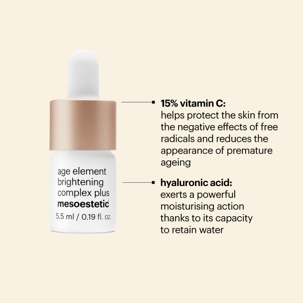Mesoestetic Age Element Brightening Complex Plus is an intensive shock treatment that combines powerful brightening and anti-aging benefits. At its core is a stabilised 15% Vitamin C complex, expertly encapsulated to maintain maximum potency until the moment of use.