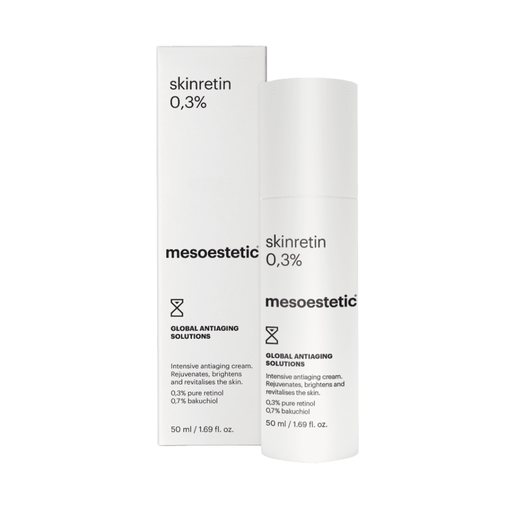 Mesoestetic Global Anti-Ageing Solutions Skinretin 0.3% is an advanced night cream that harnesses the powerful combination of pure retinol and bakuchiol to deliver comprehensive anti-ageing benefits. This innovative formula works intensively to regenerate and renew the skin, effectively tackling multiple signs of ageing including deep wrinkles, expression lines, uneven tone, and loss of elasticity.