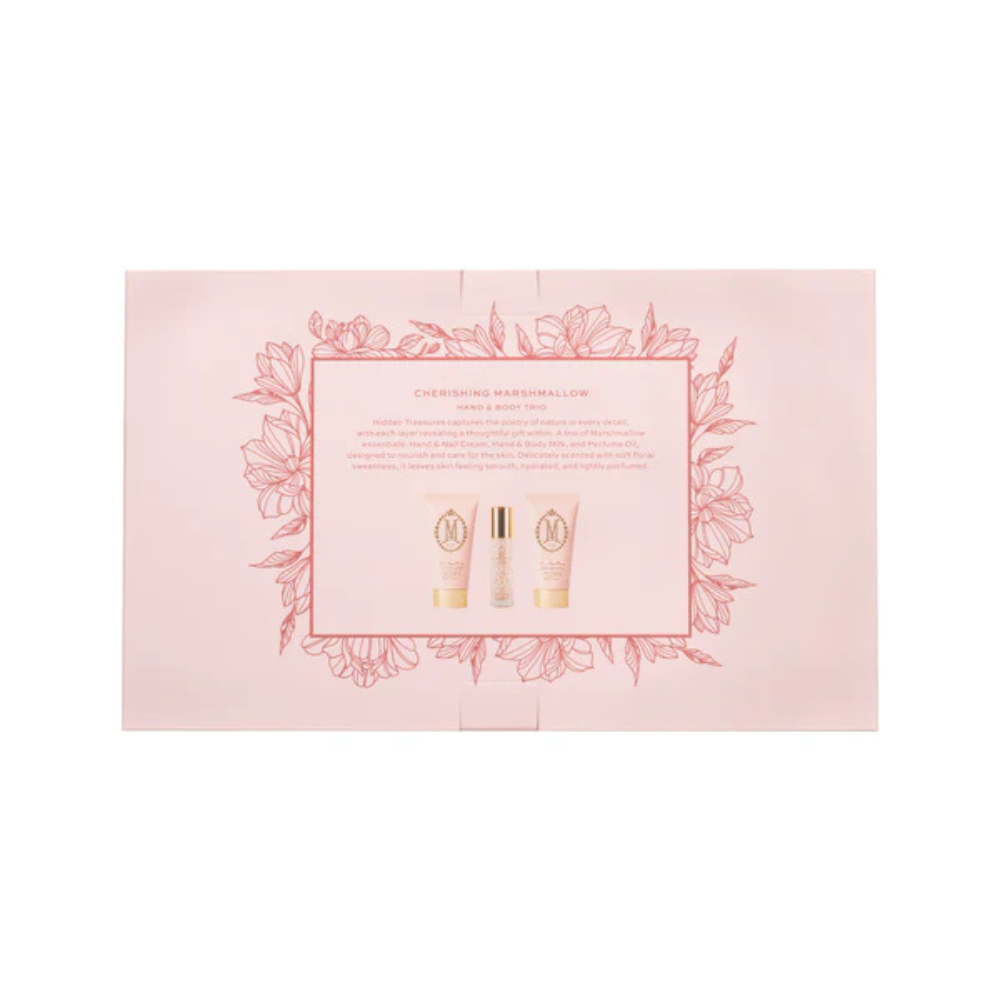 Hidden Treasures captures the poetry of nature in every detail, with each layer revealing a thoughtful gift within. A trio of Marshmallow essentials: Hand & Nail Cream, Hand & Body Milk, and Perfume Oil, designed to nourish and care for the skin. Delicately scented with soft floral sweetness, it leaves skin feeling smooth, hydrated, and lightly perfumed.