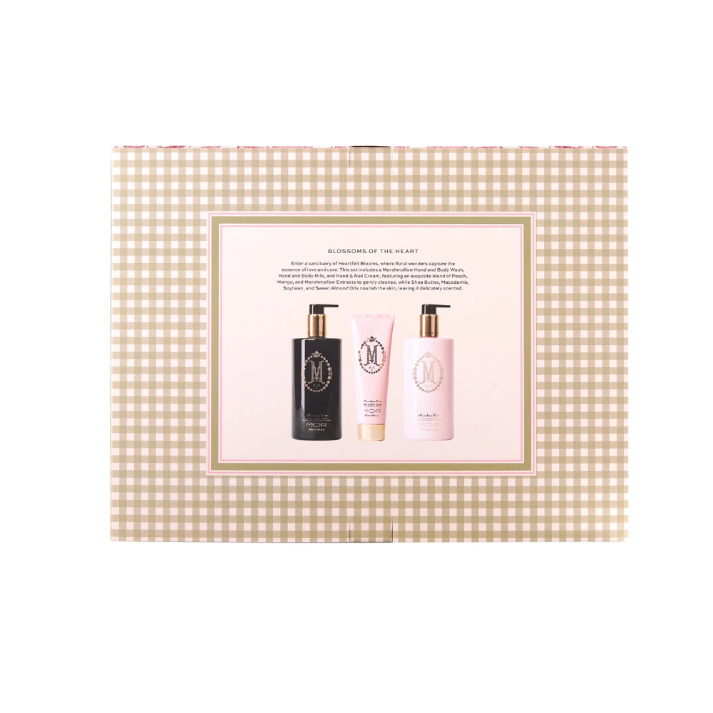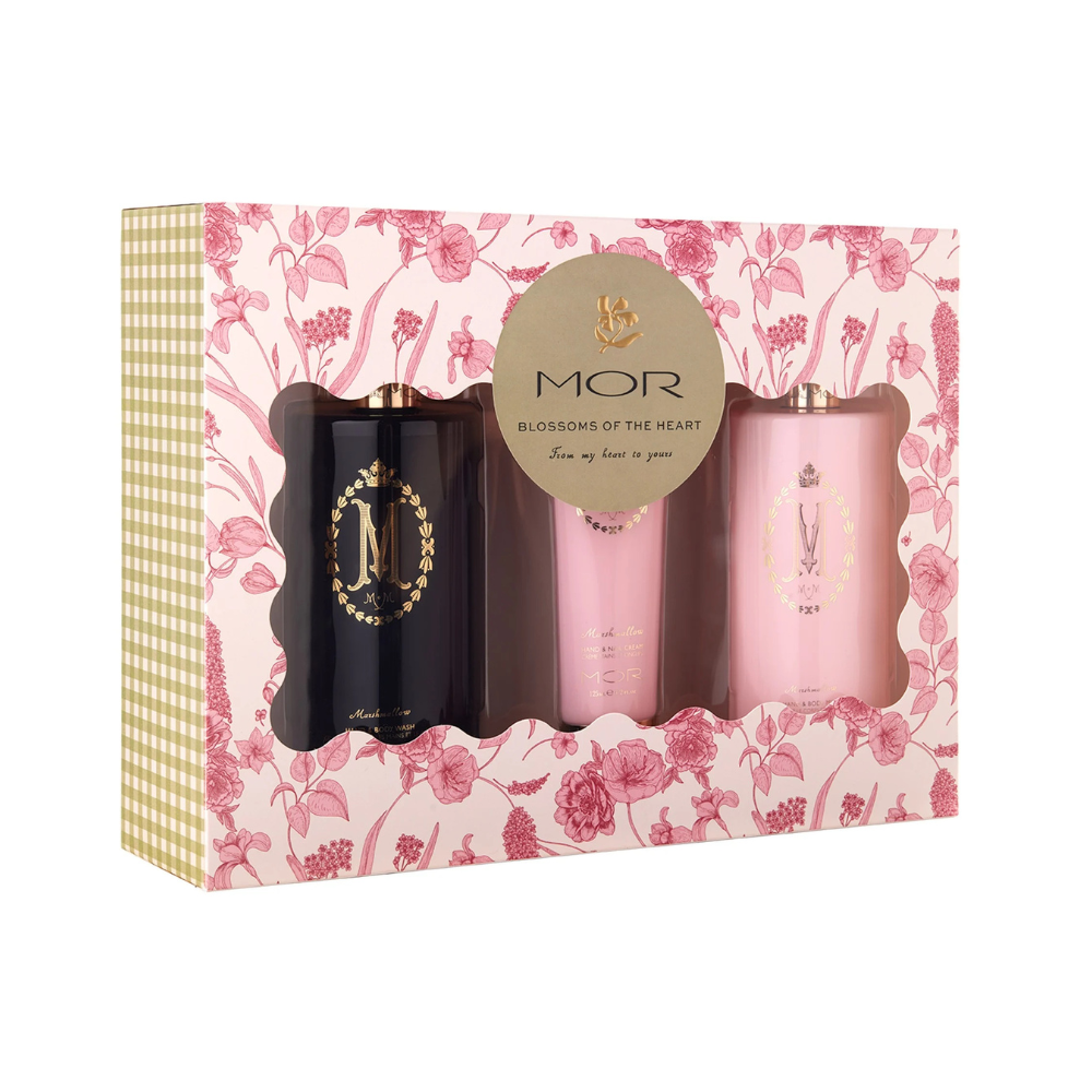 Immerse yourself in sensuous luxury with the MOR Heartfelt Blooms - Blossoms Of the Heart Gift Box. This exquisite collection showcases the feminine and lush Mor Marshmallow collection, featuring flirty floral notes of snow musk, jasmine, white carnation and English rose, complemented by a delectable base of delicate marshmallow and Madagascan vanilla.
