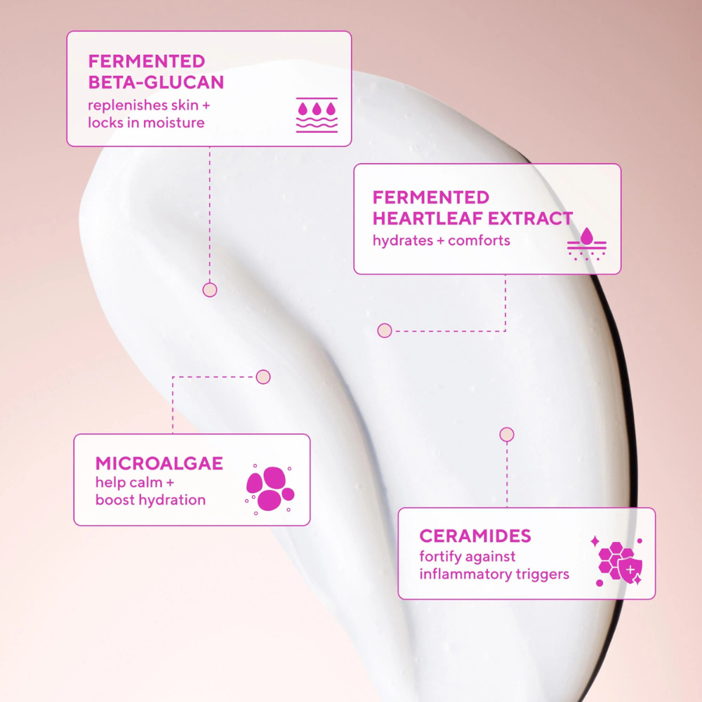 Water/Aqua/Eau, Glycerin, Cetearyl Alcohol, Sodium Cocoyl Isethionate, Houttuynia Cordata Extract, Beta-Glucan, Ceramide NP, Phaeodactylum Tricornutum Extract, Urea, Yeast Amino Acids, Trehalose, Inositol, Taurine, Betaine, Lactobacillus Ferment, Pentylene Glycol, Propanediol, Xanthan Gum, Lecithin, Tetrasodium Glutamate Diacetate, Citric Acid, Leuconostoc/Radish Root Ferment Filtrate, Tocopherol, Sodium Benzoate, Caprylyl Glycol
