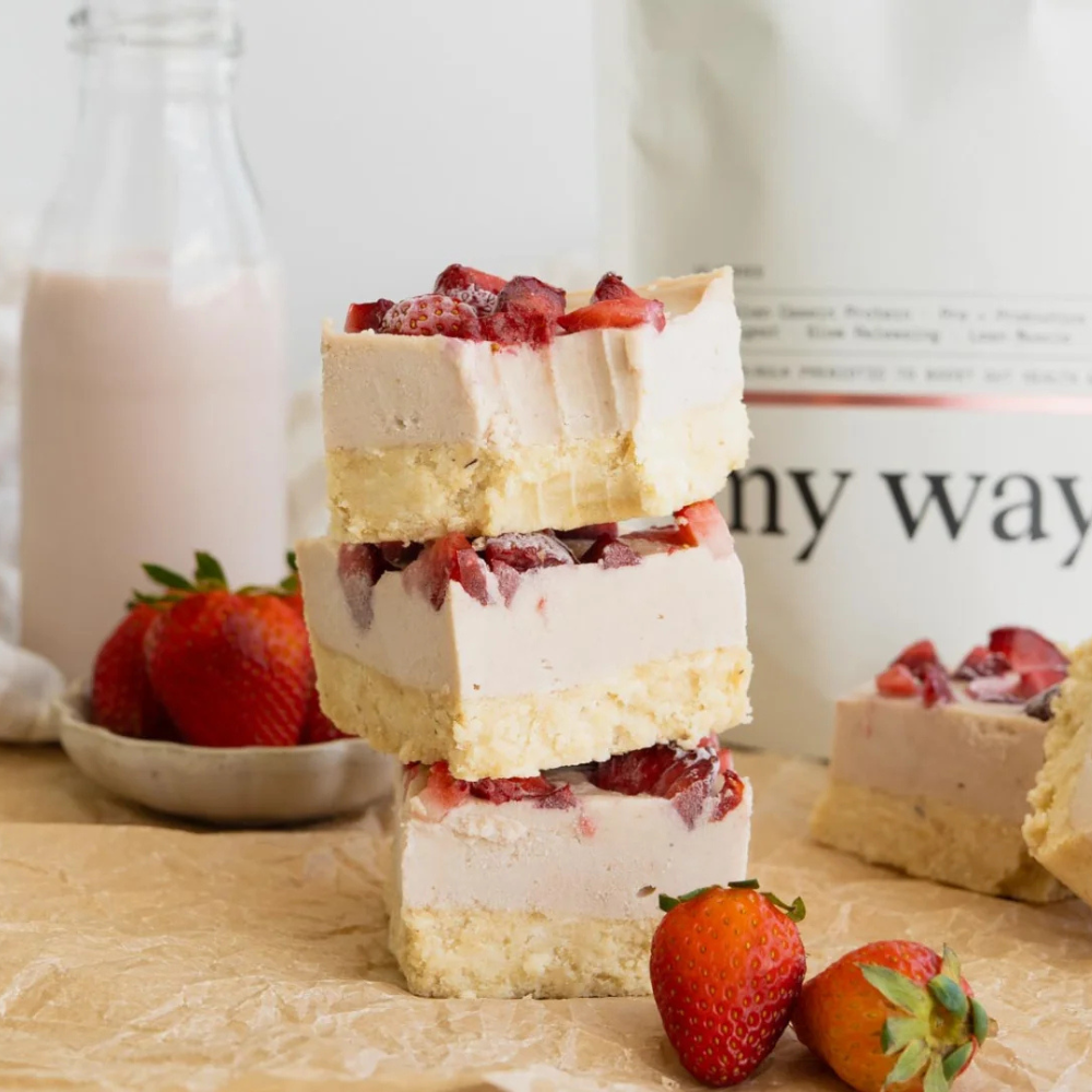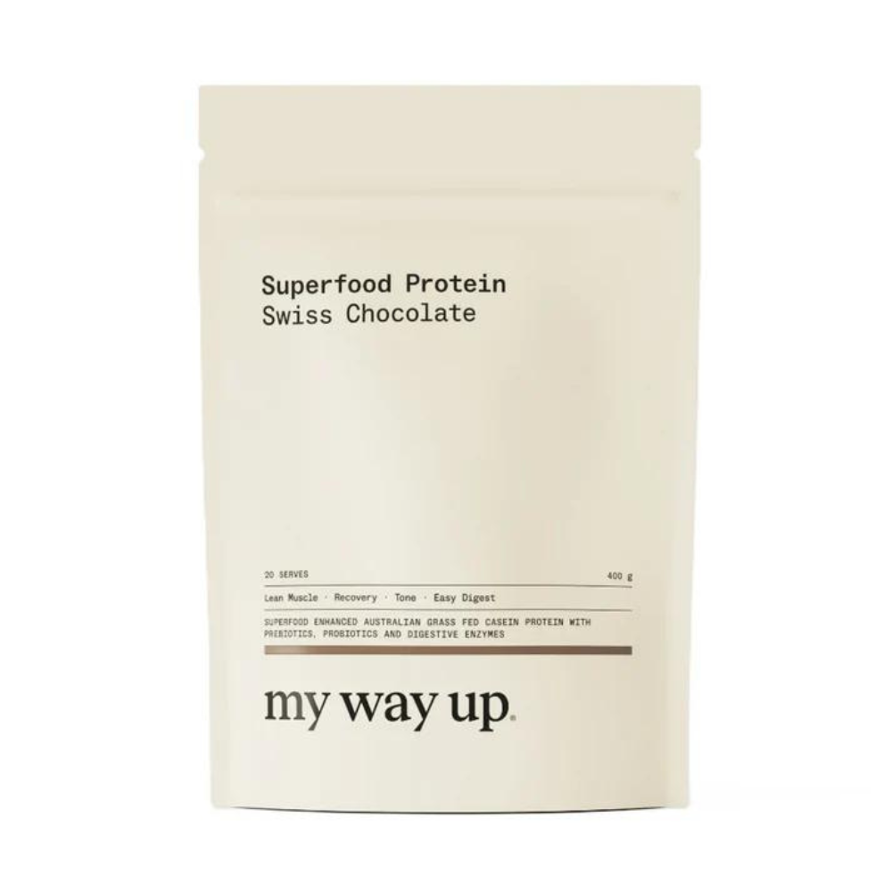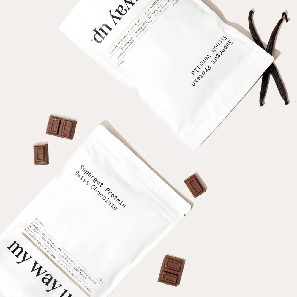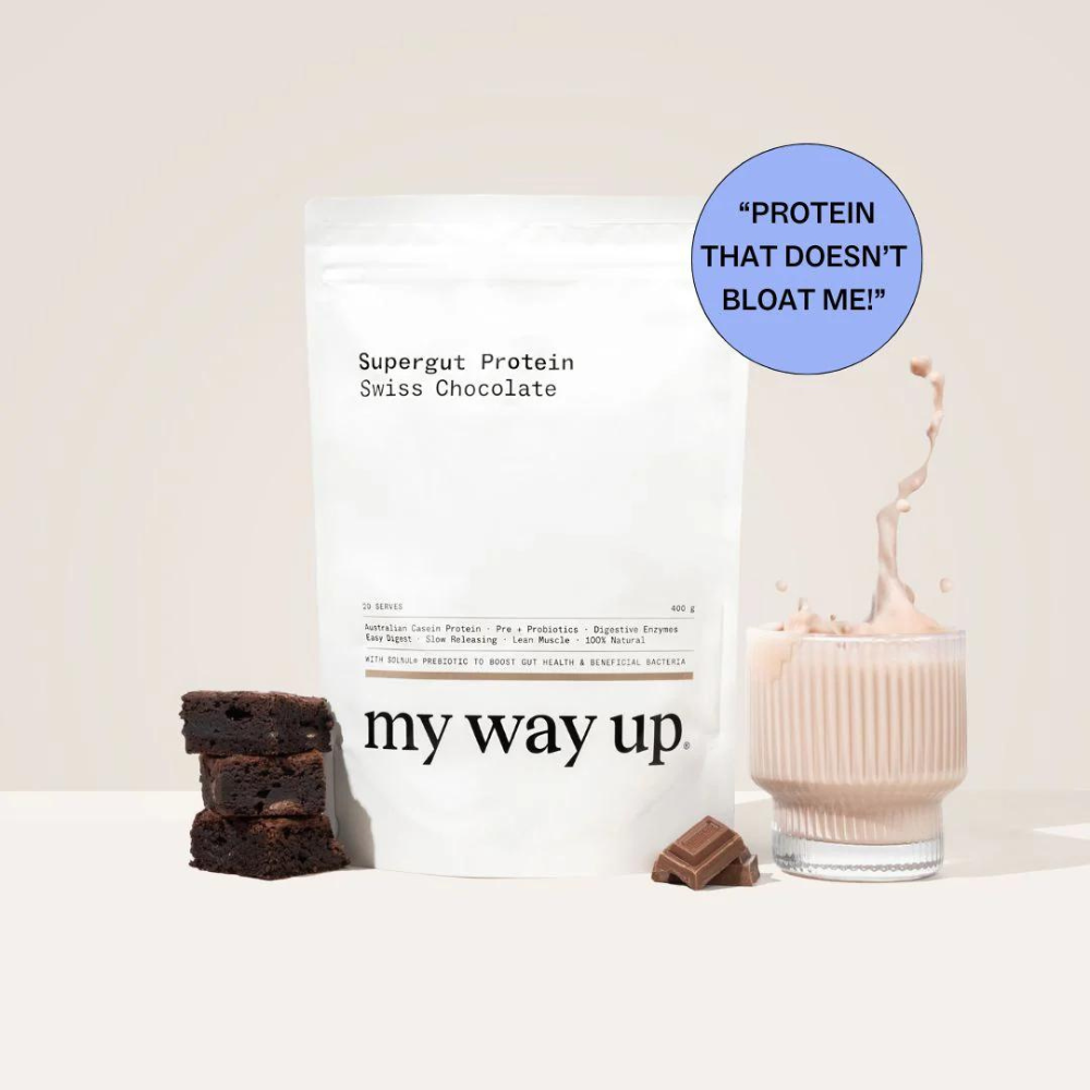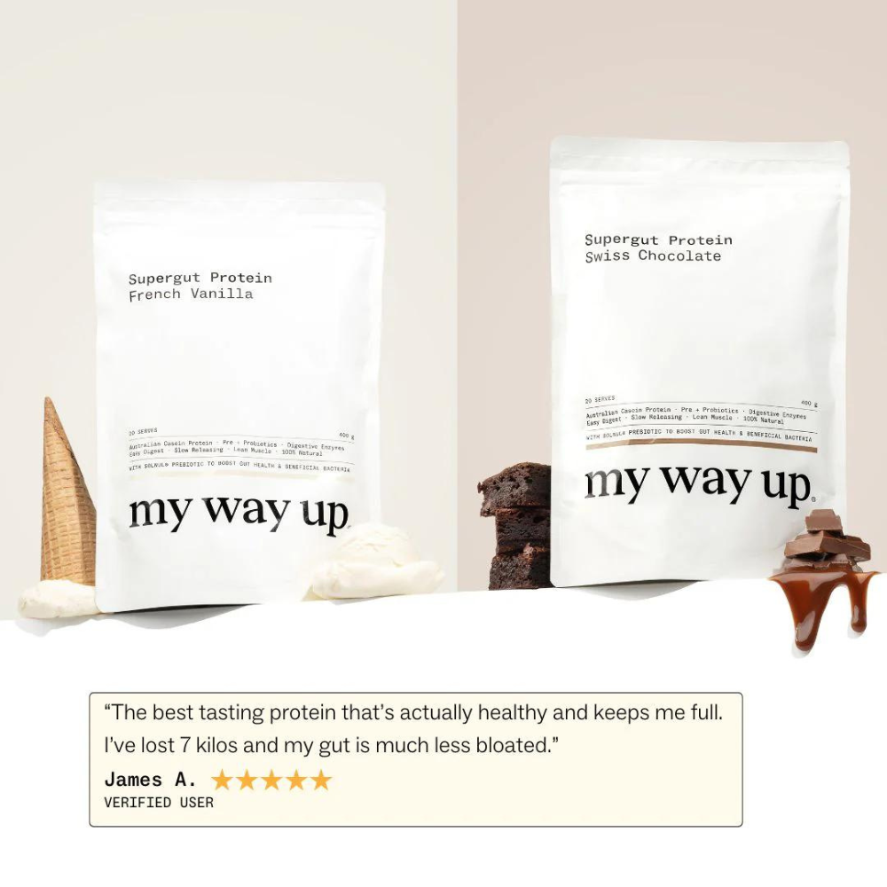 Unlike standard protein powders, my way up Supergut Protein focuses on both protein supplementation and gut health. It contains slow-releasing Australian casein protein, prebiotics, probiotics, and digestive enzymes to support better digestion, blood sugar balance, and a healthier gut microbiome.