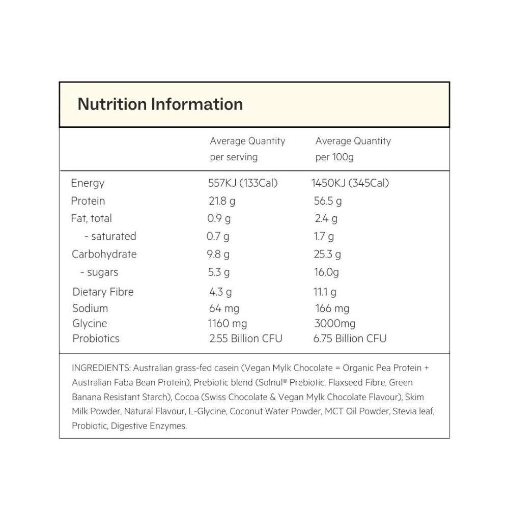 Australian grass-fed casein, SolNul® Prebiotic (Resistant Potato Starch), Cocoa (Swiss Chocolate), Skim Milk Powder, Natural Flavour, L-Glycine, Vegetable Fibre, Coconut Water Powder, Green Banana Resistant Starch, MCT Oil Powder, Stevia leaf, Probiotic (Bacillus coagulans), Digestive Enzymes (protease, amylase, cellulase, lactase, lipase).