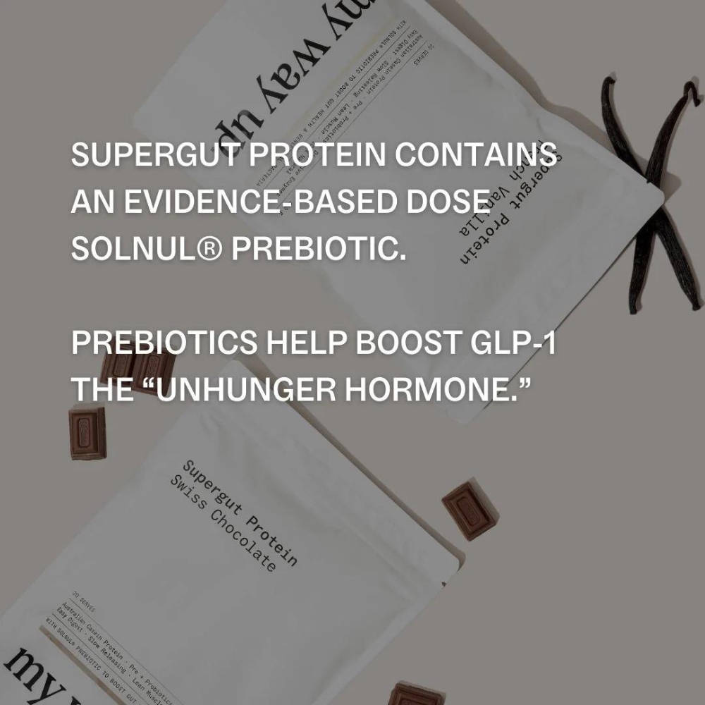 my way up Supergut Protein is a revolutionary protein supplement designed to keep you fuller for longer while supporting optimal gut health. This super clean, slow-digesting formula features fresh Australian-sourced protein combined with a blood sugar balancing blend of prebiotics, including the clinically studied Solnul®.