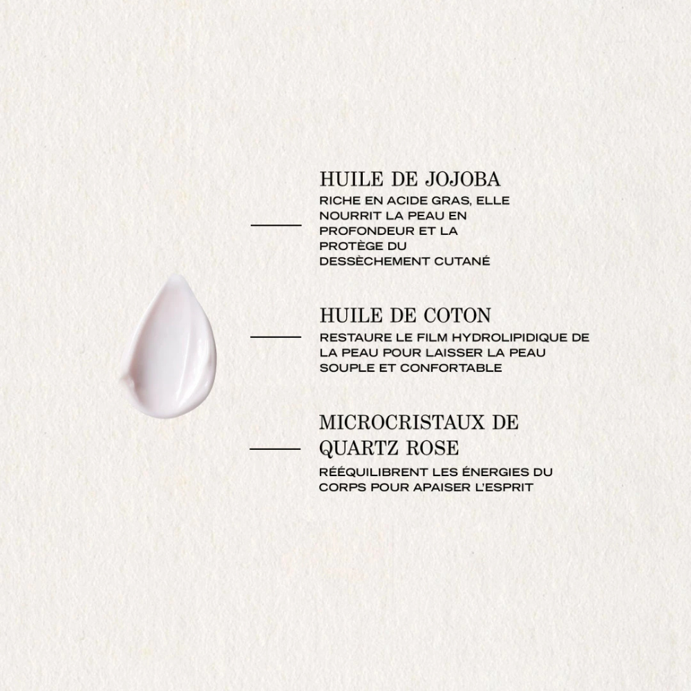 The rich, unctuous texture features rose quartz microcrystals that create a subtle illuminating effect, while shea butter and cotton seed oil work in harmony to provide lasting comfort to even the driest skin. Enveloped in delicate powdery and musky floral notes, this cream transforms daily moisturising into a truly sensorial experience.
