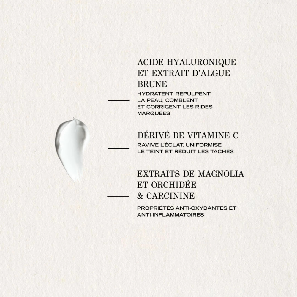 The sophisticated formulation harnesses the power of magnolia and orchid extracts combined with carcinine for antioxidant protection. Enhanced with a dual-action hyaluronic acid complex and vitamin C derivative, this cream works to restore skin's natural defense mechanisms while providing deep hydration and radiance-boosting benefits.