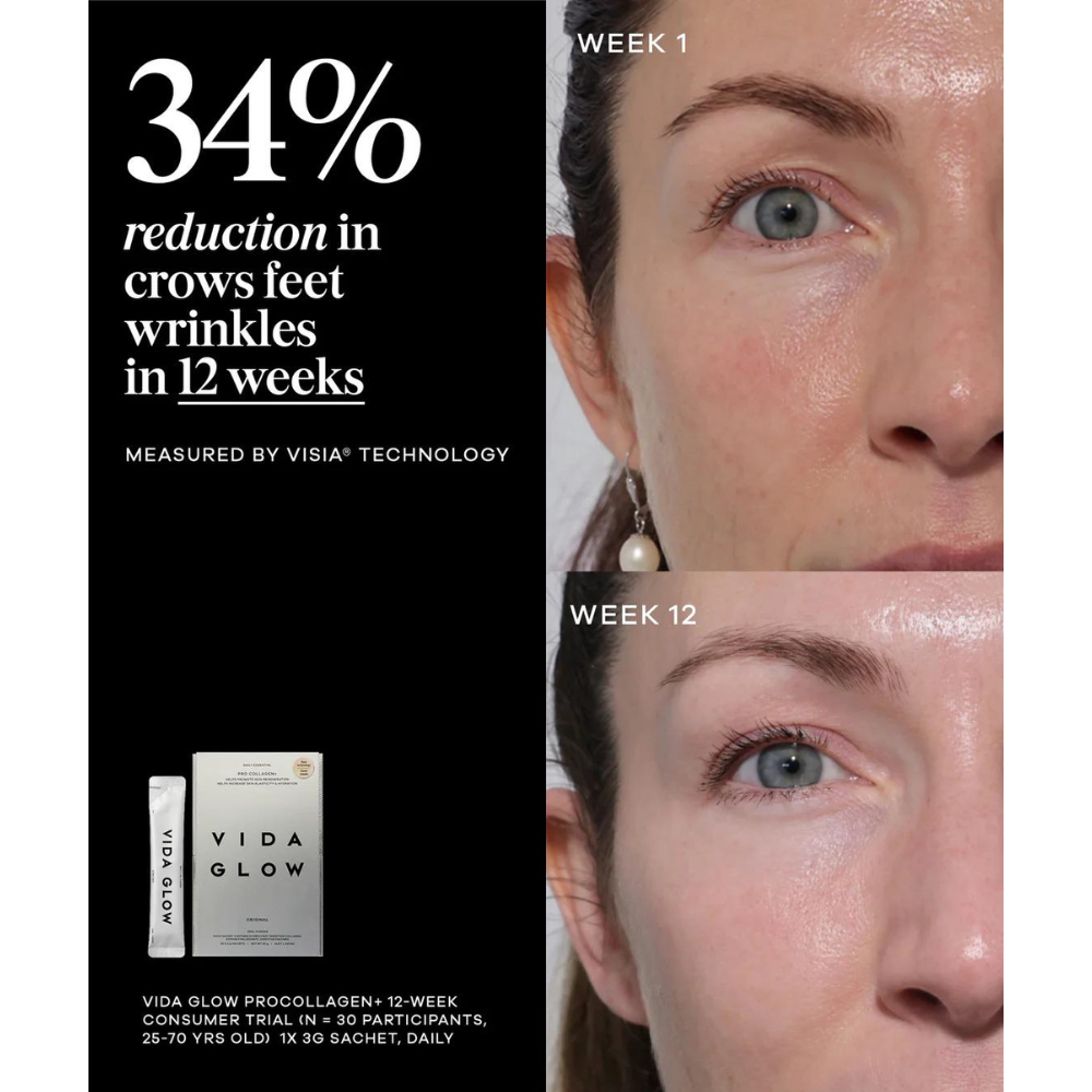 Vida Glow Pro Collagen+ is an innovative collagen complex designed for advanced skin aging concerns. As part of your daily routine, it targets deeper lines and significantly reduces wrinkle count. This cutting-edge formula combines hydrolysed marine collagen tripeptides, a clinically studied dose of hyaluronic acid, and digestive enzymes to accelerate results across skin texture, hydration, elasticity, and wrinkle reduction.